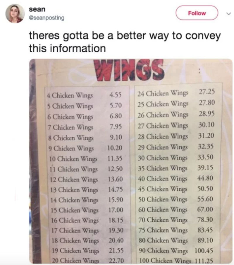 Chicken wing price meme. Hes been in. Typically wing prices reach their highest point in the weeks leading up to the Super Bowl. But then six wings are 680 on the menu and seven wings will run you 795 meaning that suddenly additional wings are 110 and 115.