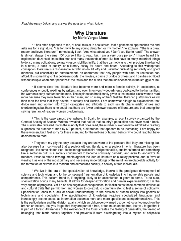 In his article Nuevas Inquicisiones New Inquisitions Vargas explained that literature has always had opponents. Vargas Llosas vision of reality is consistently binary as can be seen from the titles of some of his works. Hindi translation of the essay Why Literature. In this essay Llosa writes that it is crucial for literature to be a part of peoples lives. It is for my wife my young daughter or my mother he explains. Why Literature by Mario Vargas Llosa A reaction paper of Lyra C. Literature is the food of the rebellious spirit the promulgator of non-conformities the refuge for those who have too much or too little in.